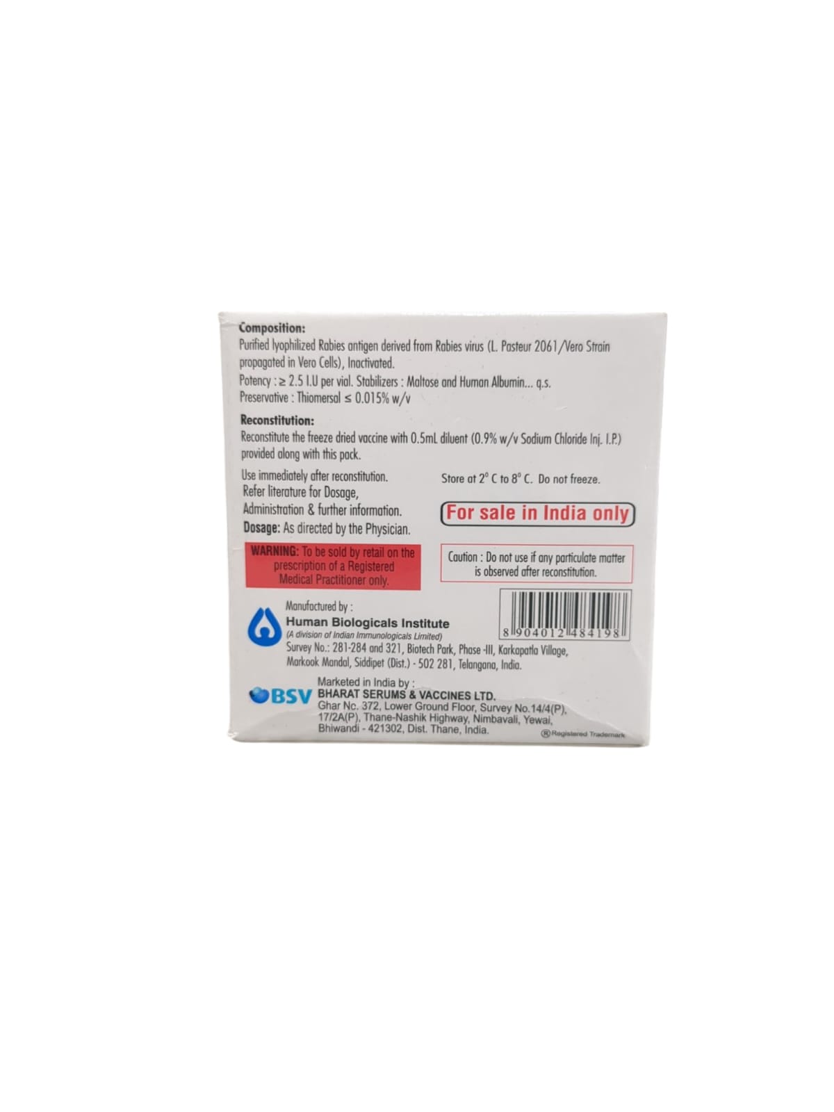 Salt/Formula: Rabies vaccine, Human (2.5IU)